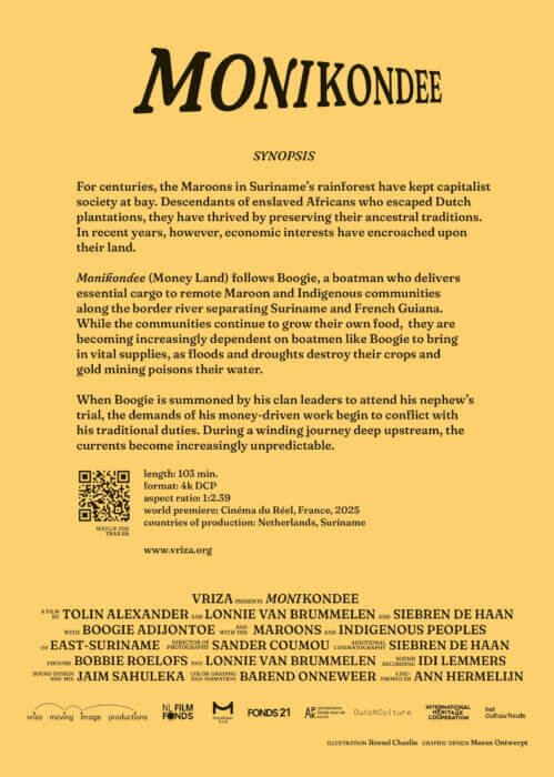 LvB: Monikondee begins where Stones Have Laws leaves off, focussing on the resilience of communities that have to deal with disruption of cultures and ecosystems through capitalist interventions. Set in the Maroni River basin, along the border between Suriname and French Guiana, the film is situated in an area where gold and other resources have been extracted since the late 19th century.