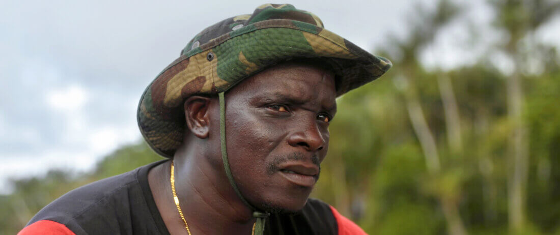 TA: Boogie is a true connector of the river. He comes from Bigiston, a village where Indigenous people and Maroons live together. Every month, he delivers oil to the Indigenous people in the mouth of the Maroni River. His father is Pamaka, and his mother Ndyuka. He’s Surinamese, but his wife is from French Guiana. She is Christian, while Boogie’s grandmother is a priestess in the Ndyuka spiritual tradition, which has many rituals to honor Mother Earth.